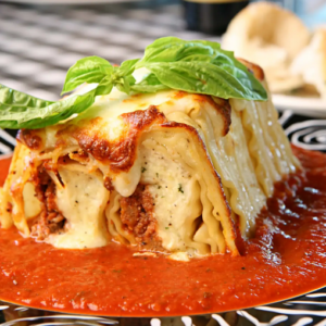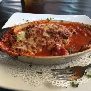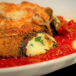 Fresh pasta filled with chopped spinach, chicken blended with mozzarella, parmigiana & ricotta cheeses, baked with marinara sauce & topped with romano & mozzarella cheeses.